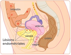 L’endométriose pelvienne profonde (ou sous- péritonéale) correspond aux lésions qui s’infiltrent en profondeur (à plus de 5 mm sous la surface du péritoine) : vagin, vessie, uretère ou le tube digestif.